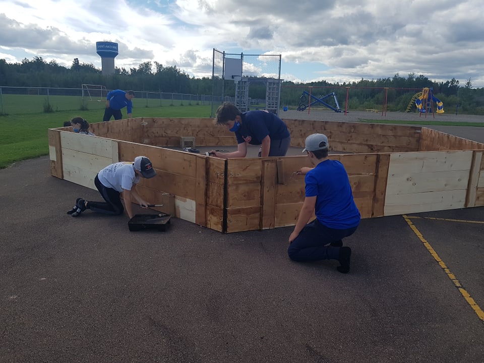 Aujourd’hui un groupe d’élèves composé de la 7e et la 8e année se sont entrepris dans la réalisation d’une deuxième arène de Gaga Ball, qui est installée en permanence sur la cour de l’école. Accompagnés de M. Alain, les élèves ont participé à toutes les étapes de production, plus particulièrement, la préparation, l’assemblage et finalement le vernissage de la structure de jeu.