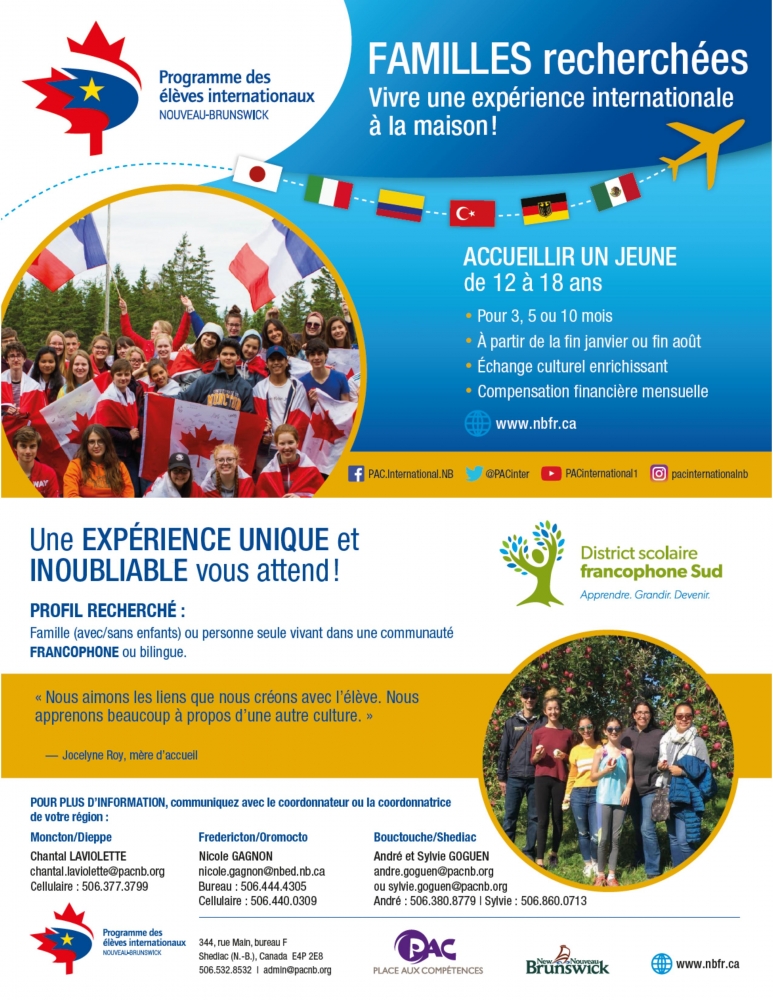 Après une année de pause à cause de la pandémie, le Programme d’accueil des élèves internationaux est prêt à accueillir des élèves à nouveau en 2021-2022. Nous sommes donc à la recherche de nouvelles familles d’accueil pour la région de Bouctouche. Ces élèves fréquenteront l’école Clément-Cormier.